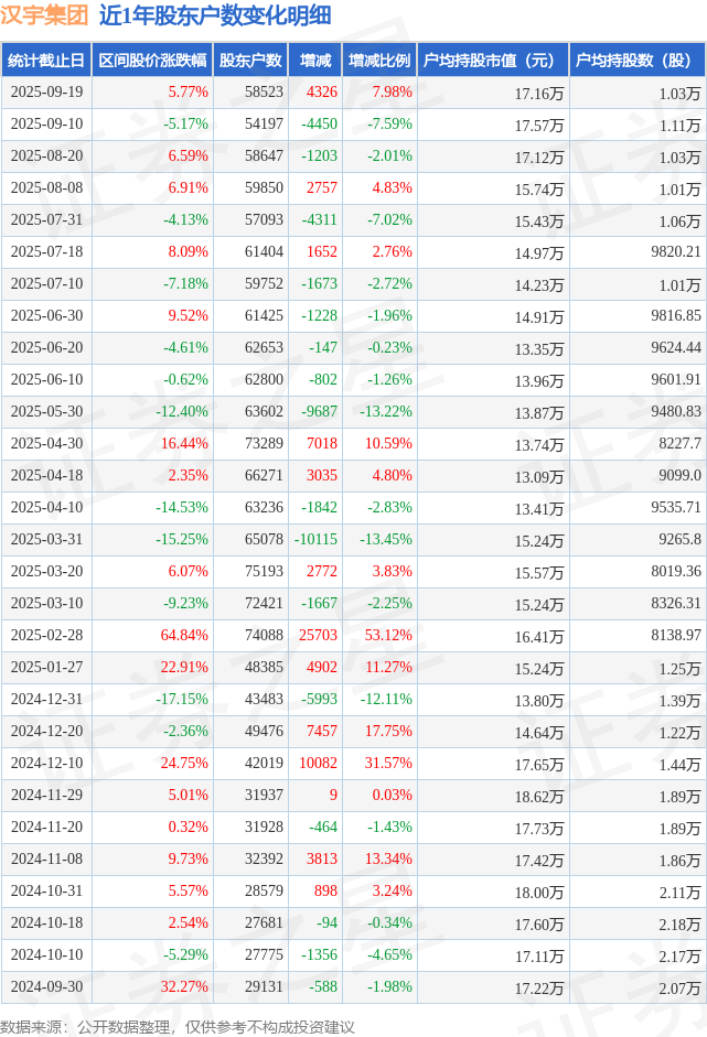 从股价来看,2025年9月10日至2025年9月19日,汉宇集团区间涨幅为5.77%,在此期间股东户数增加4326.0户,增幅为7.98%。
