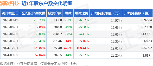 从股价来看,2025年8月31日至2025年9月19日,润欣科技区间跌幅为10.79%,在此期间股东户数减少5198.0户,减幅为6.62%。