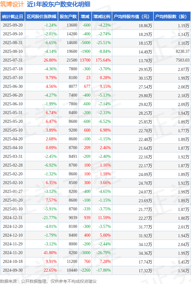 从股价来看,2025年9月10日至2025年9月20日,筑博设计区间跌幅为1.24%,在此期间股东户数减少600.0户,减幅为4.23%。
