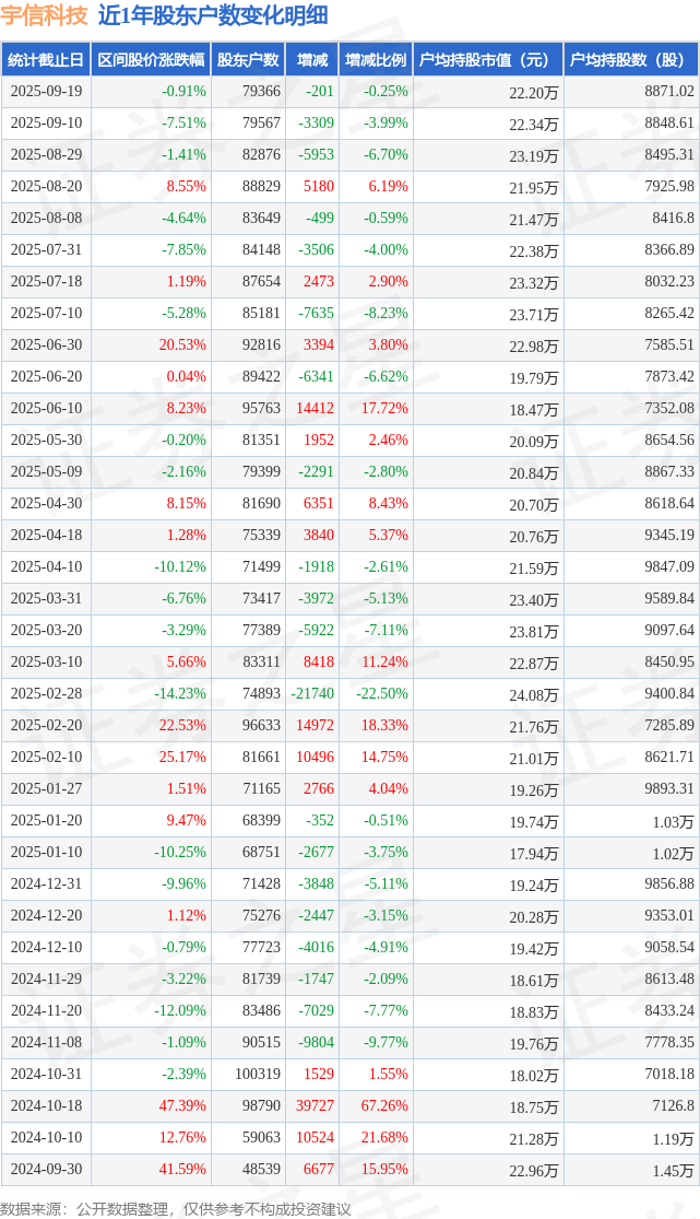 从股价来看,2025年9月10日至2025年9月19日,宇信科技区间跌幅为0.91%,在此期间股东户数减少201.0户,减幅为0.25%。