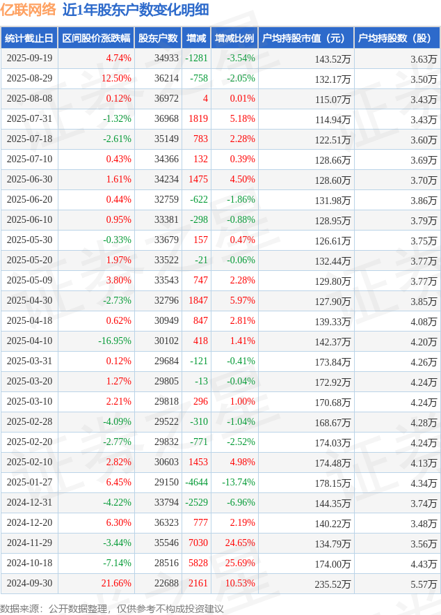 从股价来看,2025年8月29日至2025年9月19日,亿联网络区间涨幅为4.74%,在此期间股东户数减少1281.0户,减幅为3.54%。