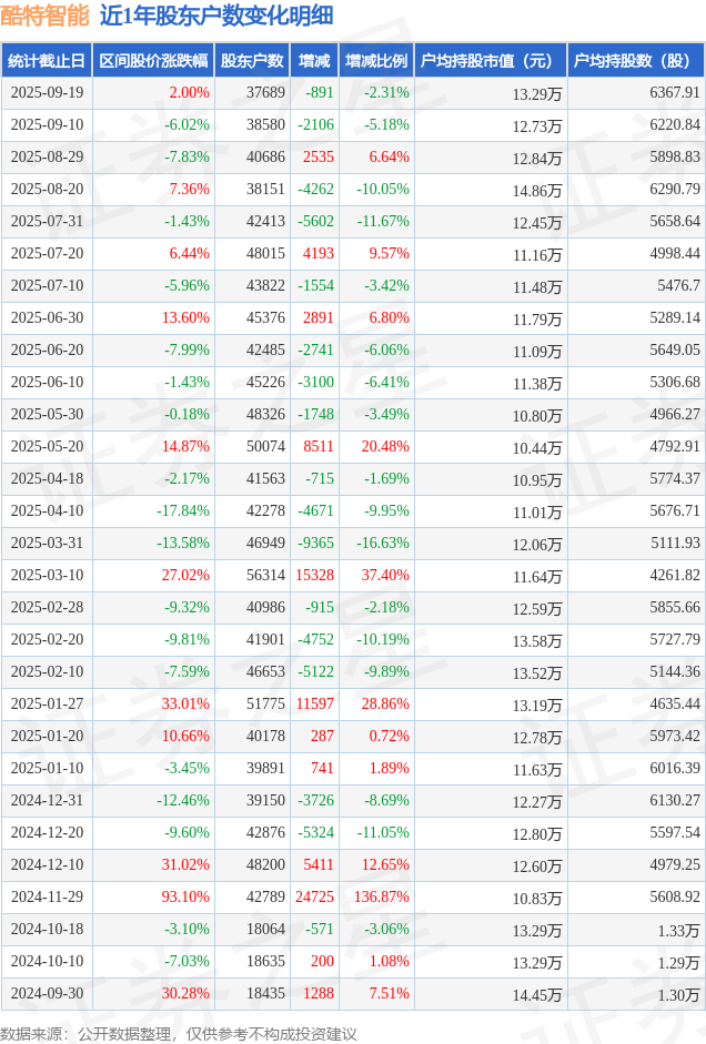 从股价来看,2025年9月10日至2025年9月19日,酷特智能区间涨幅为2.0%,在此期间股东户数减少891.0户,减幅为2.31%。