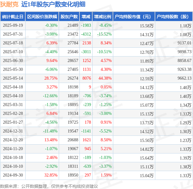 从股价来看,2025年7月31日至2025年9月19日,狄耐克区间跌幅为0.3%,在此期间股东户数减少1983.0户,减幅为8.45%。