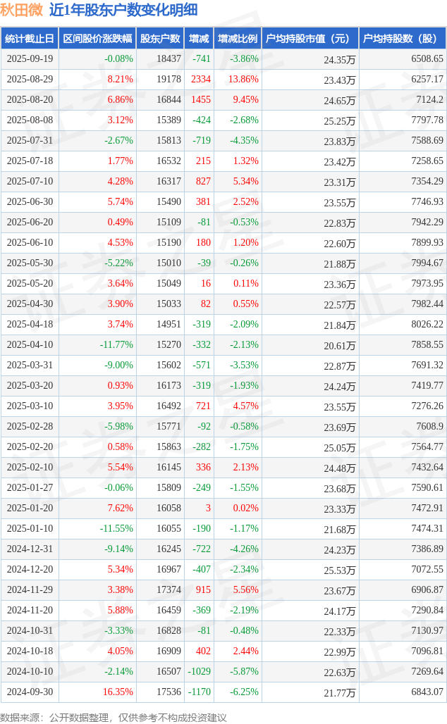 从股价来看,2025年8月29日至2025年9月19日,秋田微区间跌幅为0.08%,在此期间股东户数减少741.0户,减幅为3.86%。