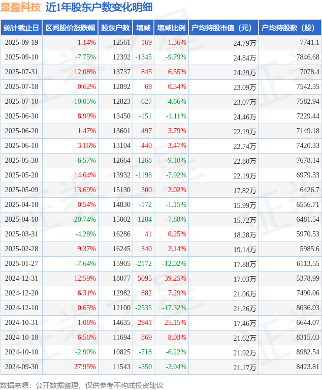 从股价来看,2025年9月10日至2025年9月19日,显盈科技区间涨幅为1.14%,在此期间股东户数增加169.0户,增幅为1.36%。