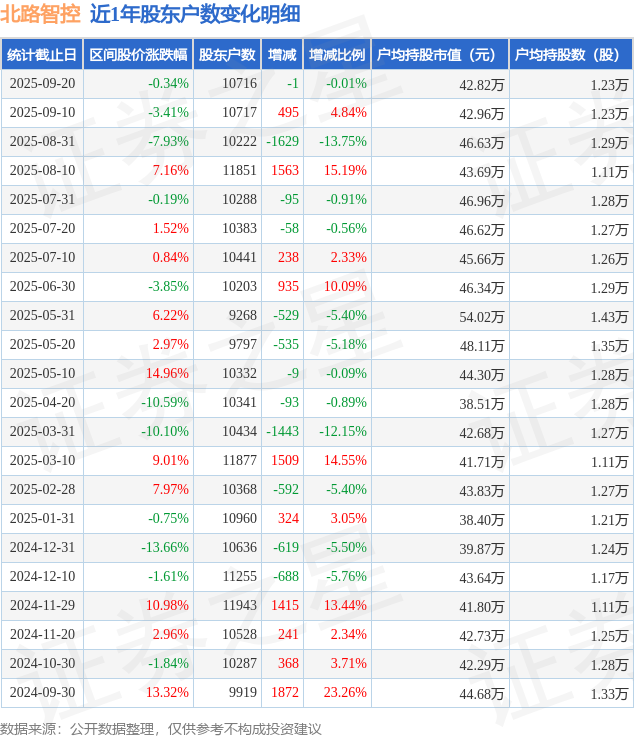 从股价来看,2025年9月10日至2025年9月20日,北路智控区间跌幅为0.34%,在此期间股东户数减少1.0户,减幅为0.01%。