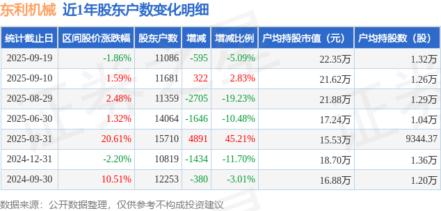 从股价来看,2025年9月10日至2025年9月19日,东利机械区间跌幅为1.86%,在此期间股东户数减少595.0户,减幅为5.09%。