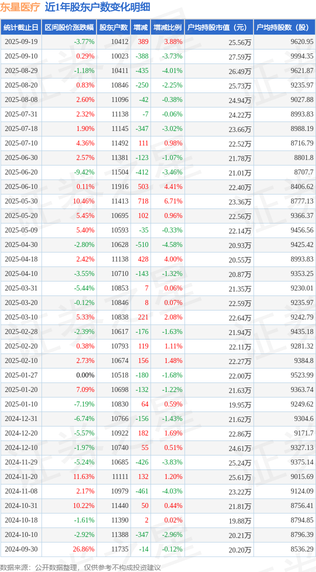 从股价来看,2025年9月10日至2025年9月19日,东星医疗区间跌幅为3.77%,在此期间股东户数增加389.0户,增幅为3.88%。