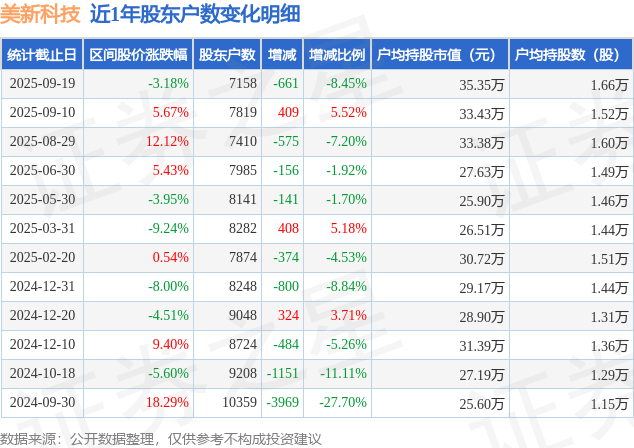 从股价来看,2025年9月10日至2025年9月19日,美新科技区间跌幅为3.18%,在此期间股东户数减少661.0户,减幅为8.45%。