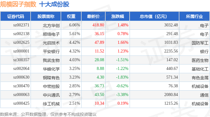 证券之星消息,9月23日,规模因子(980055)指数报收于1921.58点,跌0.12%,成交720.02亿元,换手率2.06%。当日该指数成份股中,上涨的有18家,沃尔核材以10.0%的涨幅领涨,下跌的有31家,龙佰集团以4.04%的跌幅领跌。
