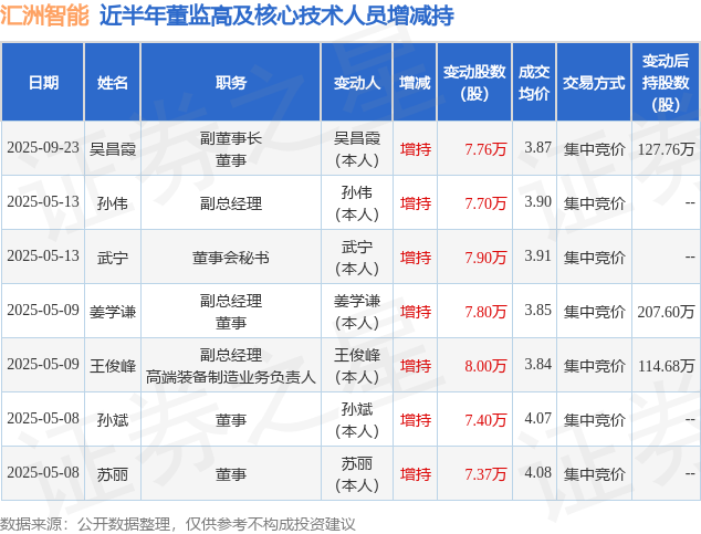 汇洲智能近半年内的董监高及核心技术人员增减持详情如下: