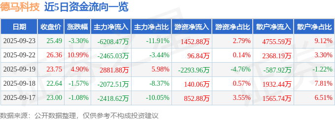 证券之星消息,截至2025年9月23日收盘,德马科技(688360)报收于25.49元,下跌3.3%,换手率8.09%,成交量20.4万手,成交额5.21亿元。