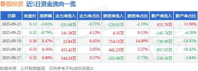 证券之星消息,截至2025年9月23日收盘,鲁银投资(600784)报收于6.12元,下跌3.01%,换手率1.32%,成交量8.92万手,成交额5474.93万元。