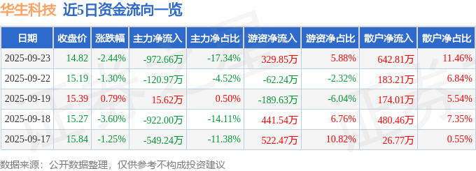 证券之星消息,截至2025年9月23日收盘,华生科技(605180)报收于14.82元,下跌2.44%,换手率2.26%,成交量3.82万手,成交额5608.57万元。