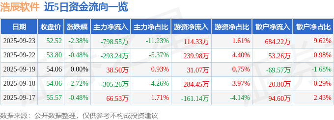 证券之星消息,截至2025年9月23日收盘,浩辰软件(688657)报收于52.52元,下跌2.38%,换手率3.39%,成交量1.37万手,成交额7111.71万元。