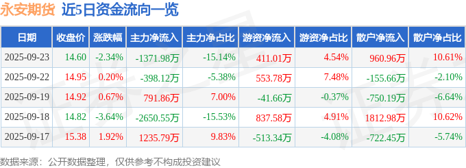 证券之星消息,截至2025年9月23日收盘,永安期货(600927)报收于14.6元,下跌2.34%,换手率0.43%,成交量6.23万手,成交额9060.41万元。