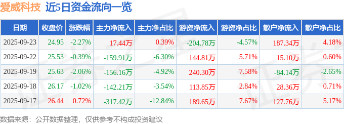 9月23日的资金流向数据方面,主力资金净流入17.44万元,占总成交额0.39%,游资资金净流出204.78万元,占总成交额4.57%,散户资金净流入187.34万元,占总成交额4.18%。