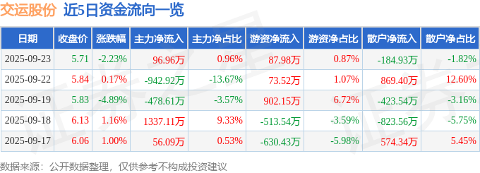 证券之星消息,截至2025年9月23日收盘,交运股份(600676)报收于5.71元,下跌2.23%,换手率1.72%,成交量17.74万手,成交额1.01亿元。