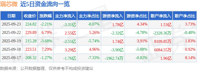 证券之星消息,截至2025年9月23日收盘,瑞芯微(603893)报收于224.82元,下跌2.21%,换手率4.33%,成交量18.22万手,成交额41.04亿元。