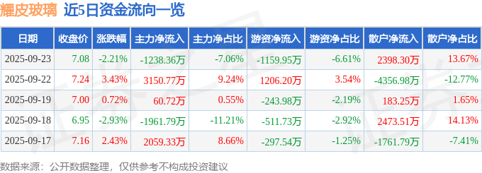 证券之星消息,截至2025年9月23日收盘,耀皮玻璃(600819)报收于7.08元,下跌2.21%,换手率3.33%,成交量24.91万手,成交额1.75亿元。