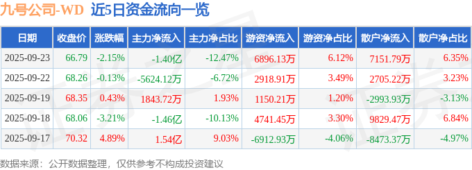 证券之星消息,截至2025年9月23日收盘,九号公司(689009)报收于66.79元,下跌2.15%,换手率3.09%,成交量16.99万手,成交额11.27亿元。