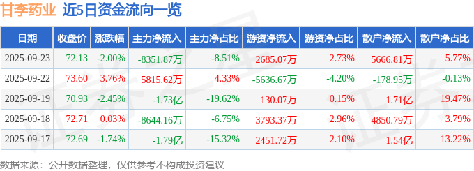 证券之星消息,截至2025年9月23日收盘,甘李药业(603087)报收于72.13元,下跌2.0%,换手率2.44%,成交量13.6万手,成交额9.82亿元。