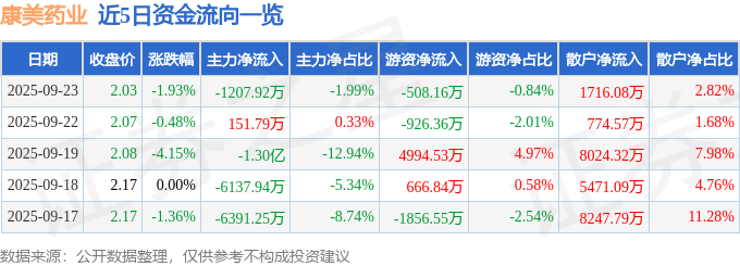 证券之星消息,截至2025年9月23日收盘,康美药业(600518)报收于2.03元,下跌1.93%,换手率2.17%,成交量299.65万手,成交额6.08亿元。