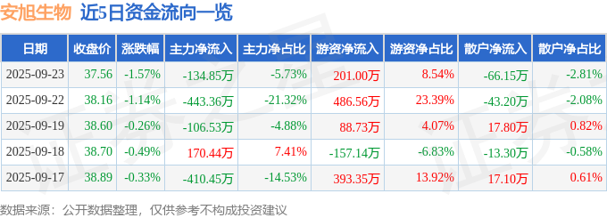 证券之星消息,截至2025年9月23日收盘,安旭生物(688075)报收于37.56元,下跌1.57%,换手率0.49%,成交量6289.0手,成交额2353.0万元。