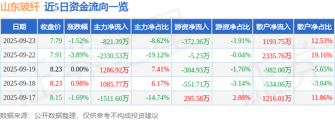证券之星消息,截至2025年9月23日收盘,山东玻纤(605006)报收于7.79元,下跌1.52%,换手率2.05%,成交量12.32万手,成交额9527.5万元。