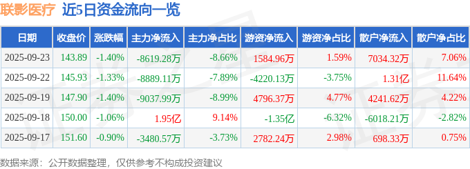 证券之星消息,截至2025年9月23日收盘,联影医疗(688271)报收于143.89元,下跌1.4%,换手率0.84%,成交量6.91万手,成交额9.96亿元。