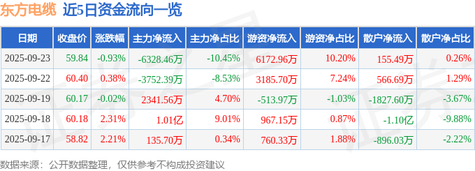 证券之星消息,截至2025年9月23日收盘,东方电缆(603606)报收于59.84元,下跌0.93%,换手率1.48%,成交量10.17万手,成交额6.05亿元。