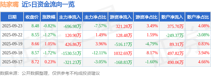 证券之星消息,截至2025年9月23日收盘,陆家嘴(600663)报收于8.48元,下跌0.82%,换手率0.35%,成交量10.94万手,成交额9211.75万元。