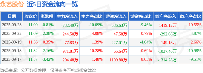 9月23日的资金流向数据方面,主力资金净流出732.49万元,占总成交额10.09%,游资资金净流出686.63万元,占总成交额9.46%,散户资金净流入1419.12万元,占总成交额19.55%。