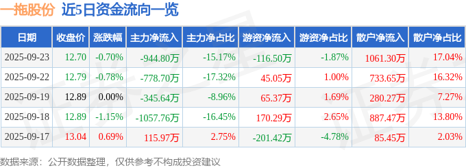 9月23日的资金流向数据方面,主力资金净流出944.8万元,占总成交额15.17%,游资资金净流出116.5万元,占总成交额1.87%,散户资金净流入1061.3万元,占总成交额17.04%。