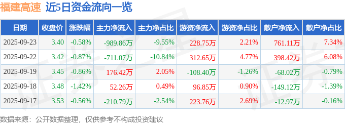 证券之星消息,截至2025年9月23日收盘,福建高速(600033)报收于3.4元,下跌0.58%,换手率1.12%,成交量30.61万手,成交额1.04亿元。