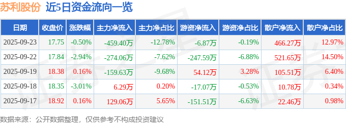 9月23日的资金流向数据方面,主力资金净流出459.4万元,占总成交额12.78%,游资资金净流出6.87万元,占总成交额0.19%,散户资金净流入466.27万元,占总成交额12.97%。