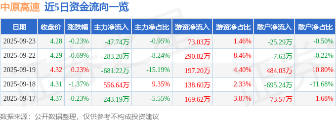 证券之星消息,截至2025年9月23日收盘,中原高速(600020)报收于4.28元,下跌0.23%,换手率0.52%,成交量11.76万手,成交额5011.1万元。