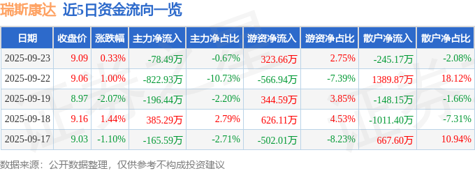 证券之星消息,截至2025年9月23日收盘,瑞斯康达(603803)报收于9.09元,上涨0.33%,换手率3.08%,成交量13.08万手,成交额1.18亿元。