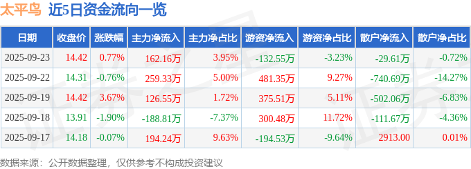 证券之星消息,截至2025年9月23日收盘,太平鸟(603877)报收于14.42元,上涨0.77%,换手率0.62%,成交量2.89万手,成交额4103.37万元。