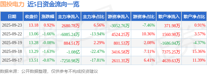 证券之星消息,截至2025年9月23日收盘,国投电力(600886)报收于13.18元,上涨0.92%,换手率0.42%,成交量31.12万手,成交额4.09亿元。