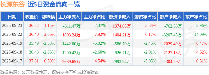 证券之星消息,截至2025年9月23日收盘,长源东谷(603950)报收于36.82元,上涨1.15%,换手率2.22%,成交量7.17万手,成交额2.57亿元。
