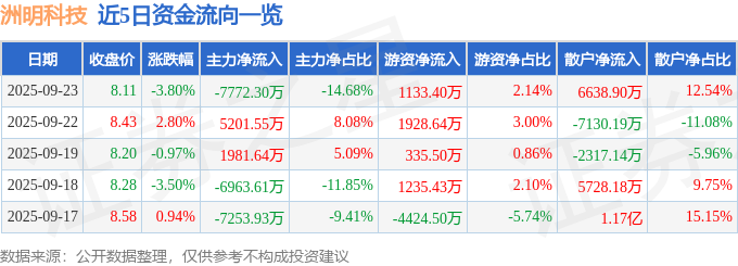 证券之星消息,截至2025年9月23日收盘,洲明科技(300232)报收于8.11元,下跌3.8%,换手率7.41%,成交量65.72万手,成交额5.29亿元。