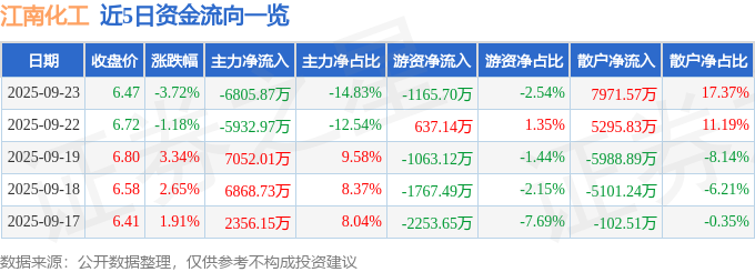 证券之星消息,截至2025年9月23日收盘,江南化工(002226)报收于6.47元,下跌3.72%,换手率2.67%,成交量70.77万手,成交额4.59亿元。