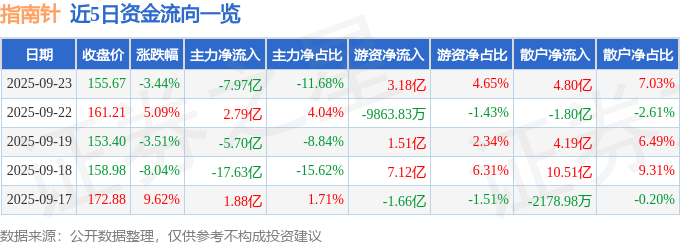 证券之星消息,截至2025年9月23日收盘,指南针(300803)报收于155.67元,下跌3.44%,换手率7.4%,成交量44.27万手,成交额68.29亿元。