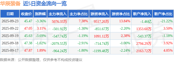 证券之星消息,截至2025年9月23日收盘,华辰装备(300809)报收于45.47元,下跌3.36%,换手率9.9%,成交量14.91万手,成交额6.88亿元。