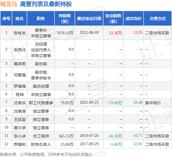 福龙马近半年内的董监高及核心技术人员增减持详情如下: