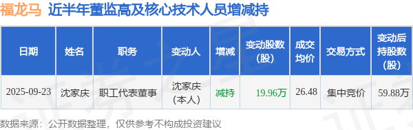 证券之星消息,根据9月23日市场公开信息、上市公司公告及交易所披露数据整理,福龙马(603686)最新董监高及相关人员股份变动情况:2025年9月23日公司职工代表董事沈家庆共减持公司股份19.96万股,占公司总股本为0.048%。变动期间公司股价上涨9.99%,9月23日当日收盘报27.97元。