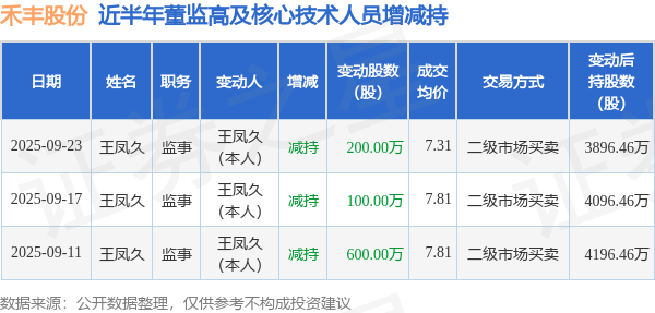 禾丰股份近半年内的董监高及核心技术人员增减持详情如下: