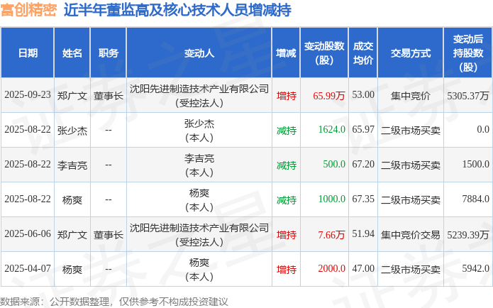 富创精密近半年内的董监高及核心技术人员增减持详情如下: