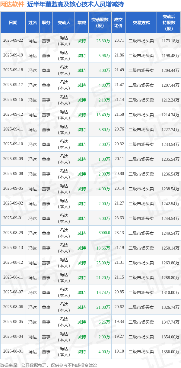 网达软件近半年内的董监高及核心技术人员增减持详情如下: